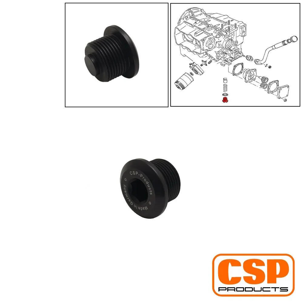 Diese eloxierte CSP Products Verschlussschraube für den Öldruckregelkolben bei Typ-4, WBX und CT-Motoren entspricht in den Abmessungen exakt dem Original-Teil. Die richtige Länge ist sehr wichtig, da sie für die korrekte Spannung der Feder des Regelkolbens sorgt und somit für einen optimalen Öldruck. Sie besteht aus Aluminium, wiegt 19 Gramm (Serie 54 g), ist lasergraviert und mit einem 10 mm Innensechskant versehen.